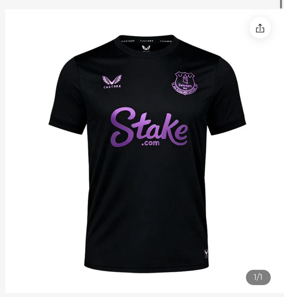 The shirt, which like the third kit is black but replaces the blue and yellow patterns with metallic purple badge and sponsor, is believed to be a new launch set to hit the Everton store this year.